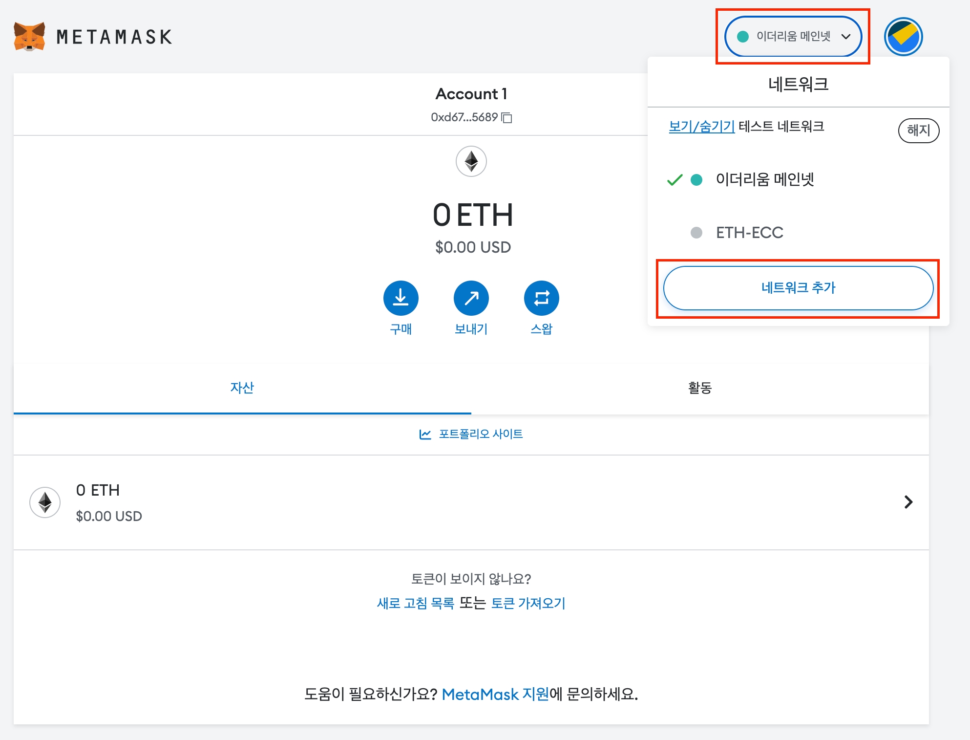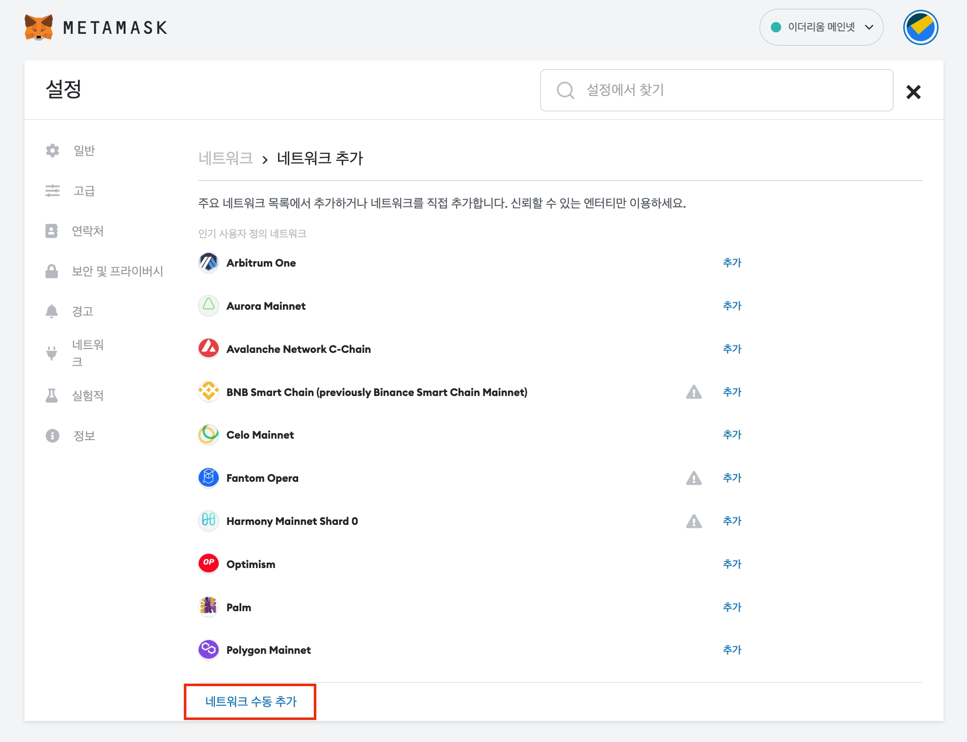 네트워크 추가 버튼을 클릭합니다.