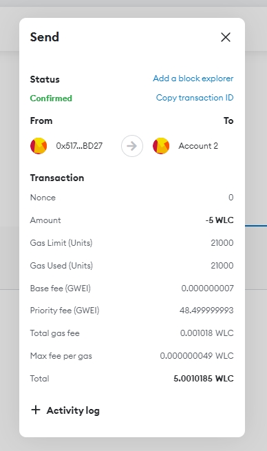 WLC를 보낸 후 지갑의 활동 탭에서 트랜잭션을 찾을 수 있습니다.